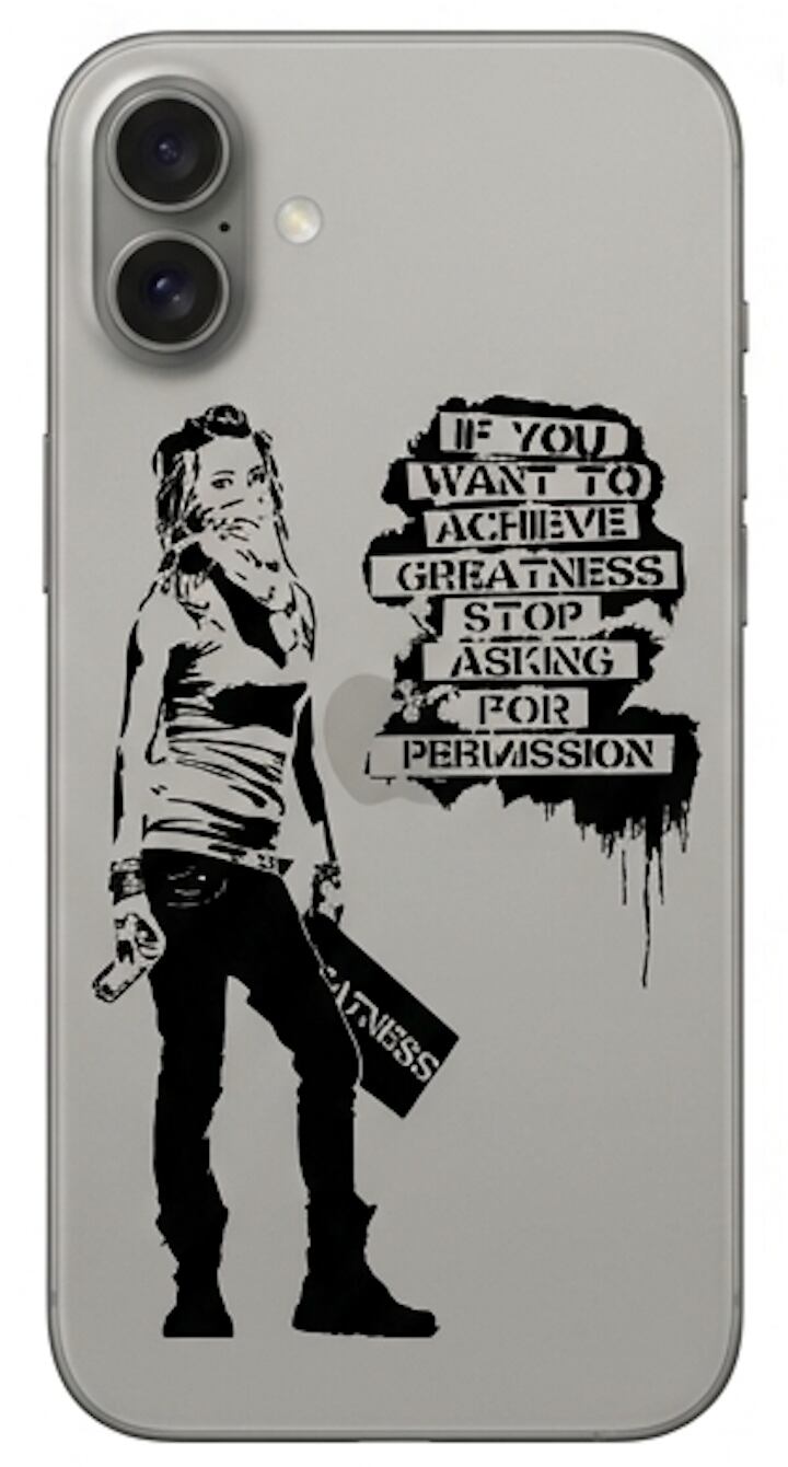 このクリアケースは、人気ストリートアーティスト・バンクシーの「Achieve Greatness」というメッセージが印刷されています。ブラックの背景がデザインを引き立て、シンプルながらも深い味わいを感じさせます。
